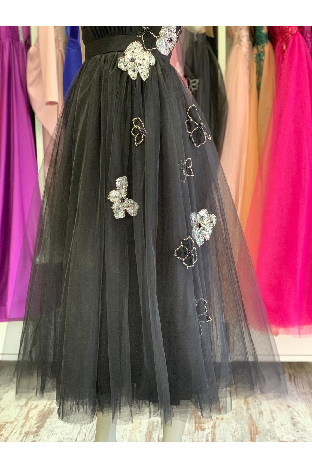 Fusta rochiei este amplă, din tulle fin și este accesorizata parțial cu dantelă.