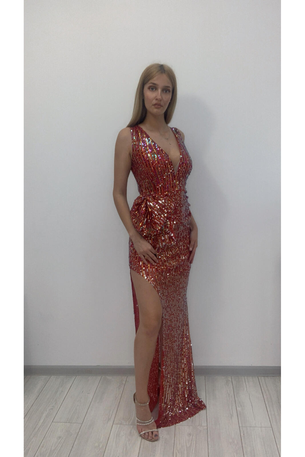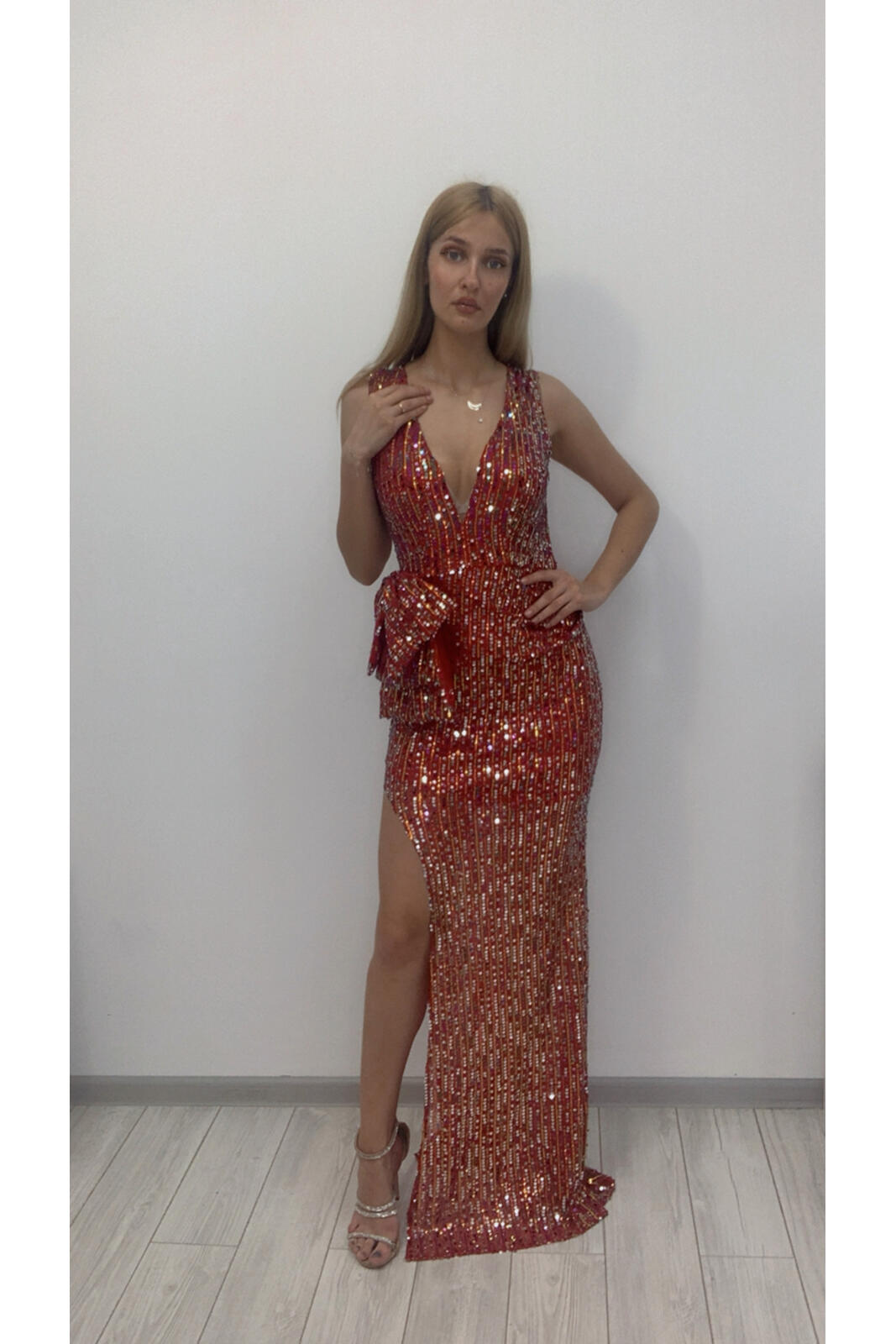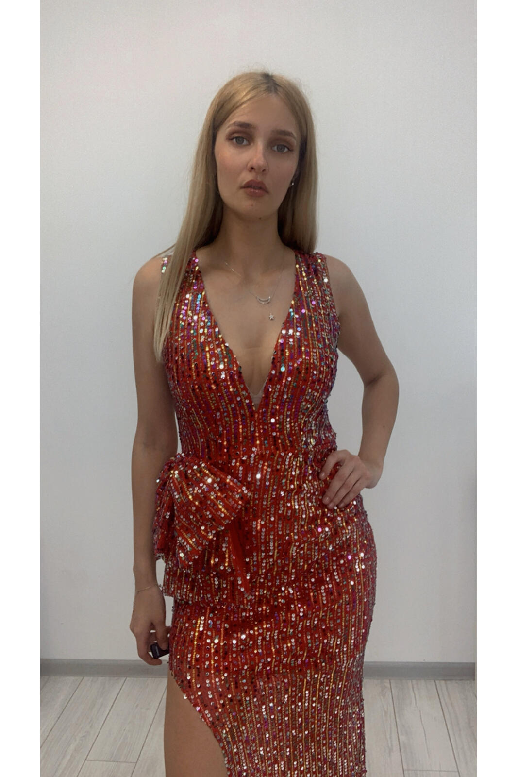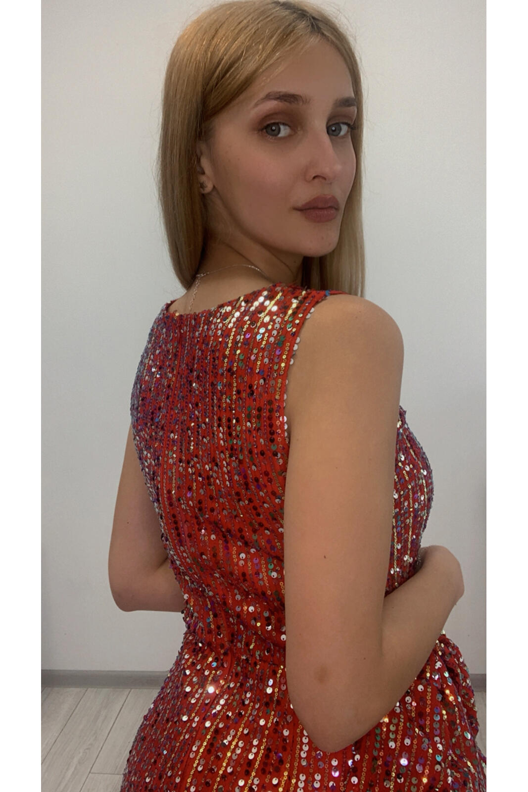 Bustul este confectionat din tesatura elastica cu aplicati de paiete, culoarea rosie