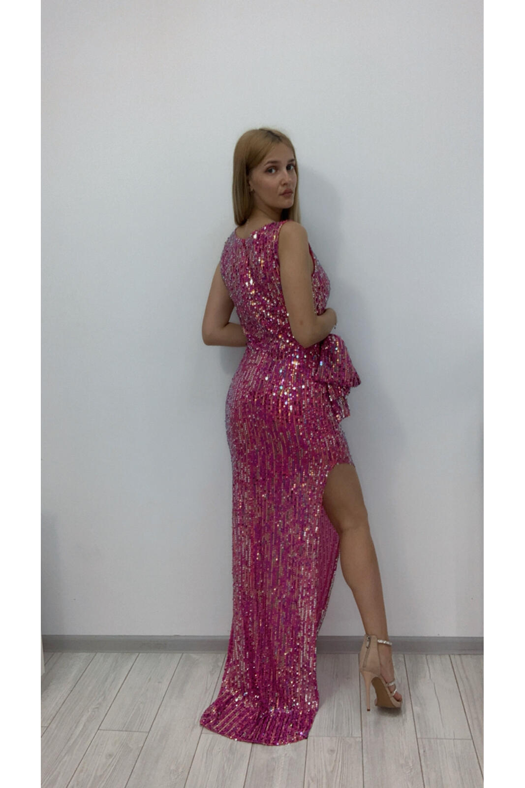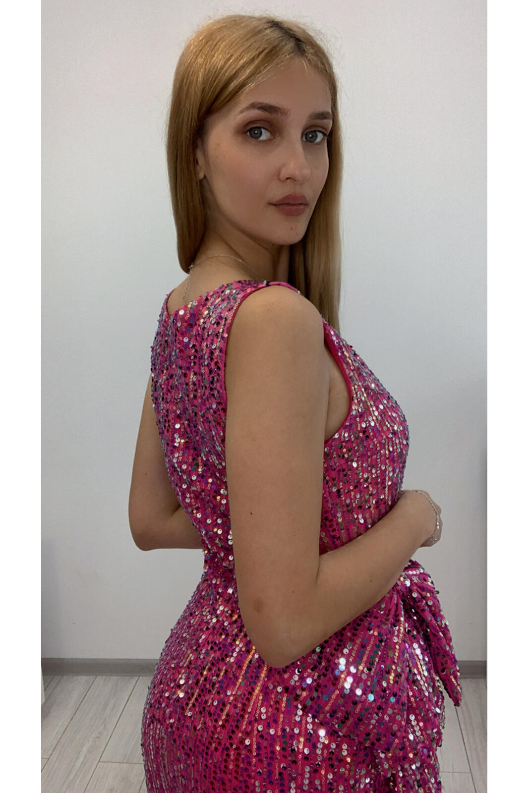 Bustul este confectionat din tesatura elastica cu aplicati de paiete, culoarea roz